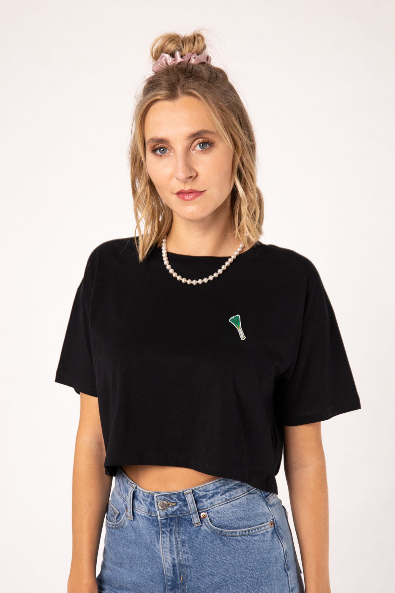 Super hochwertiges Bio Baumwoll Cropped T-Shirt mit gesticktem Lauch Design in drei verschiedenen Schnitt-Varianten: Ripped, Regular & Oversized