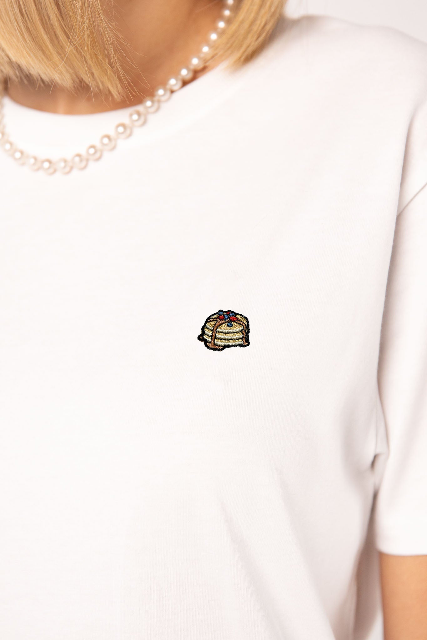 Besticktes Bio Baumwoll Frauen T-Shirt mit extrem angenehmen Stoff (155gsm) und gesticktem Pancakes Design