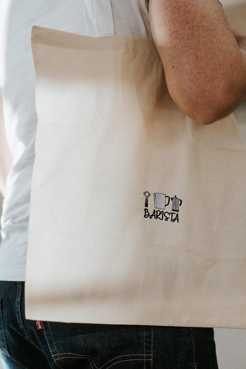 Bestickte, Fair produzierte Bio-Baumwoll-Tragetasche im Barista Set Design.