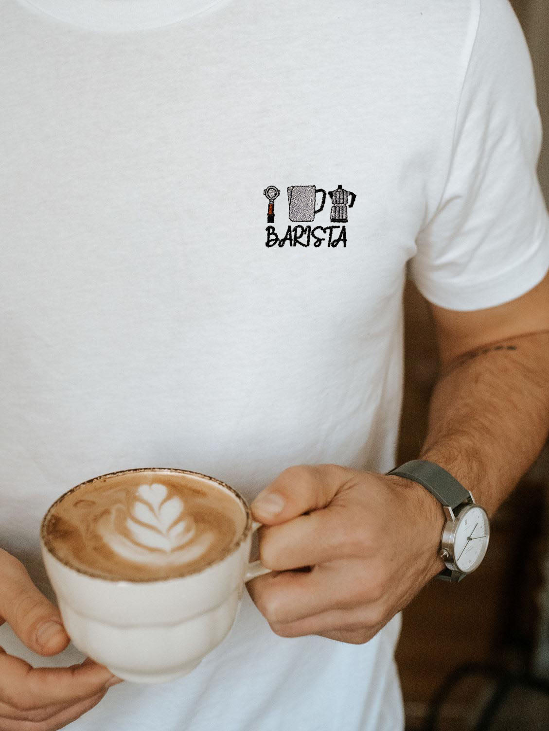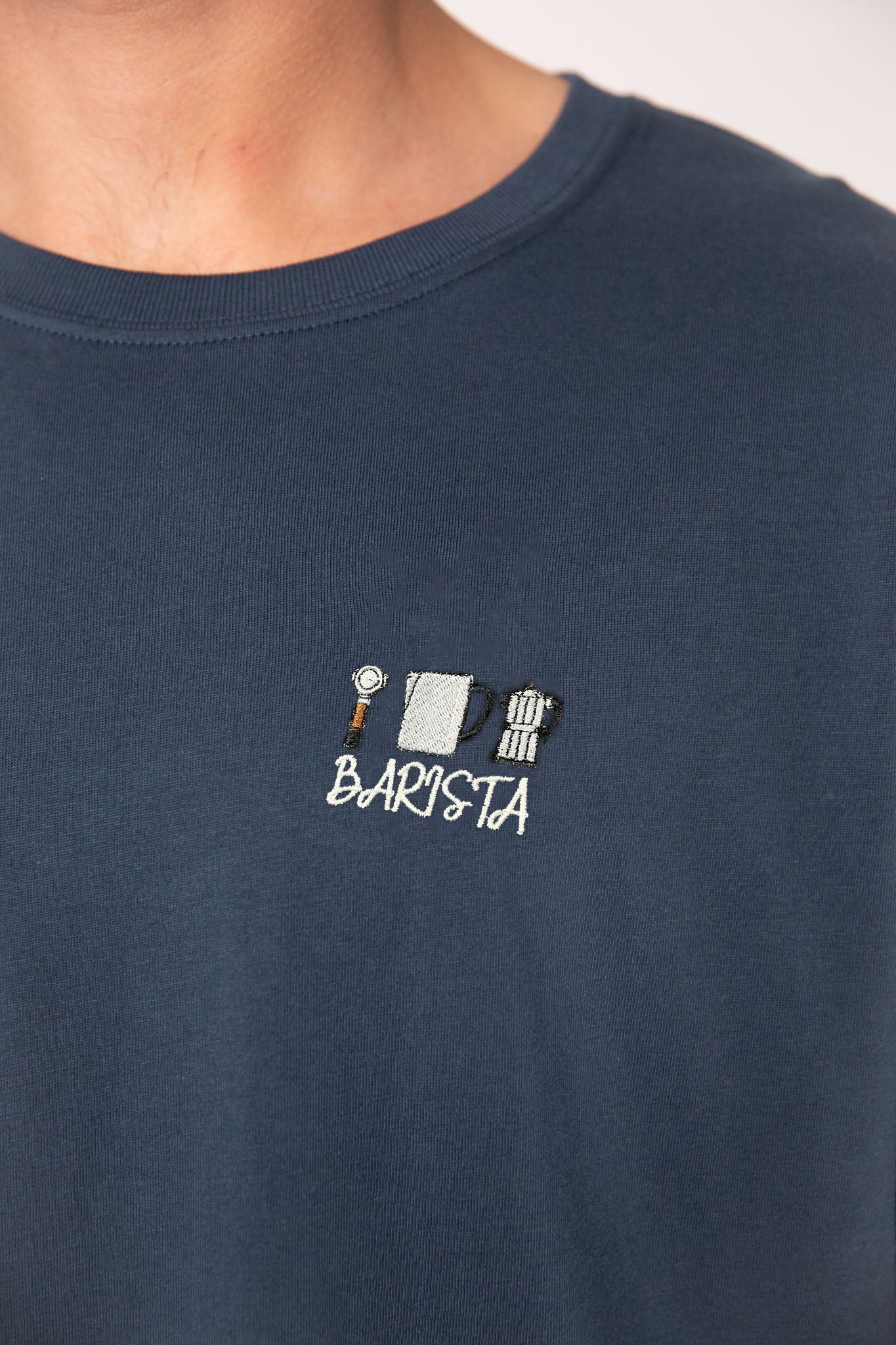 Super hochwertiges Bio Baumwoll Unisex T-Shirt mit schwerem Stoff (190gsm) und gesticktem Barista Set Design