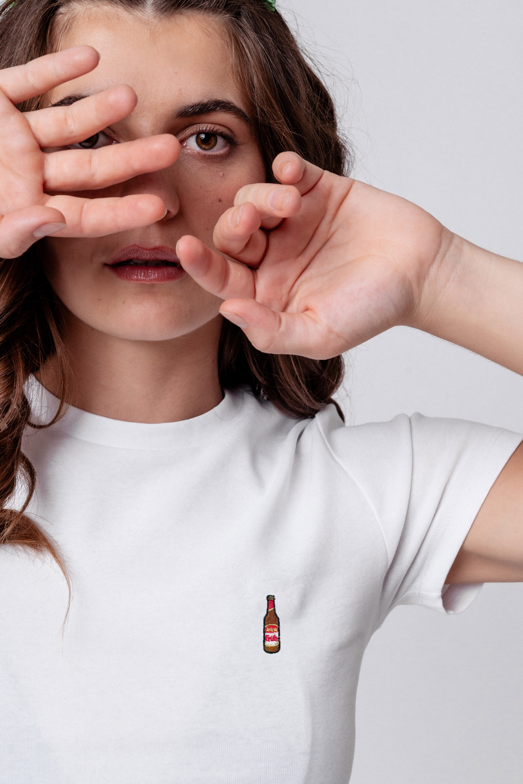 Super hochwertiges Bio Baumwoll Cropped T-Shirt mir der offiziell gestickten Früh Kölsch Flasche in drei verschiedenen Schnitt-Varianten: Ripped, Regular & Oversized