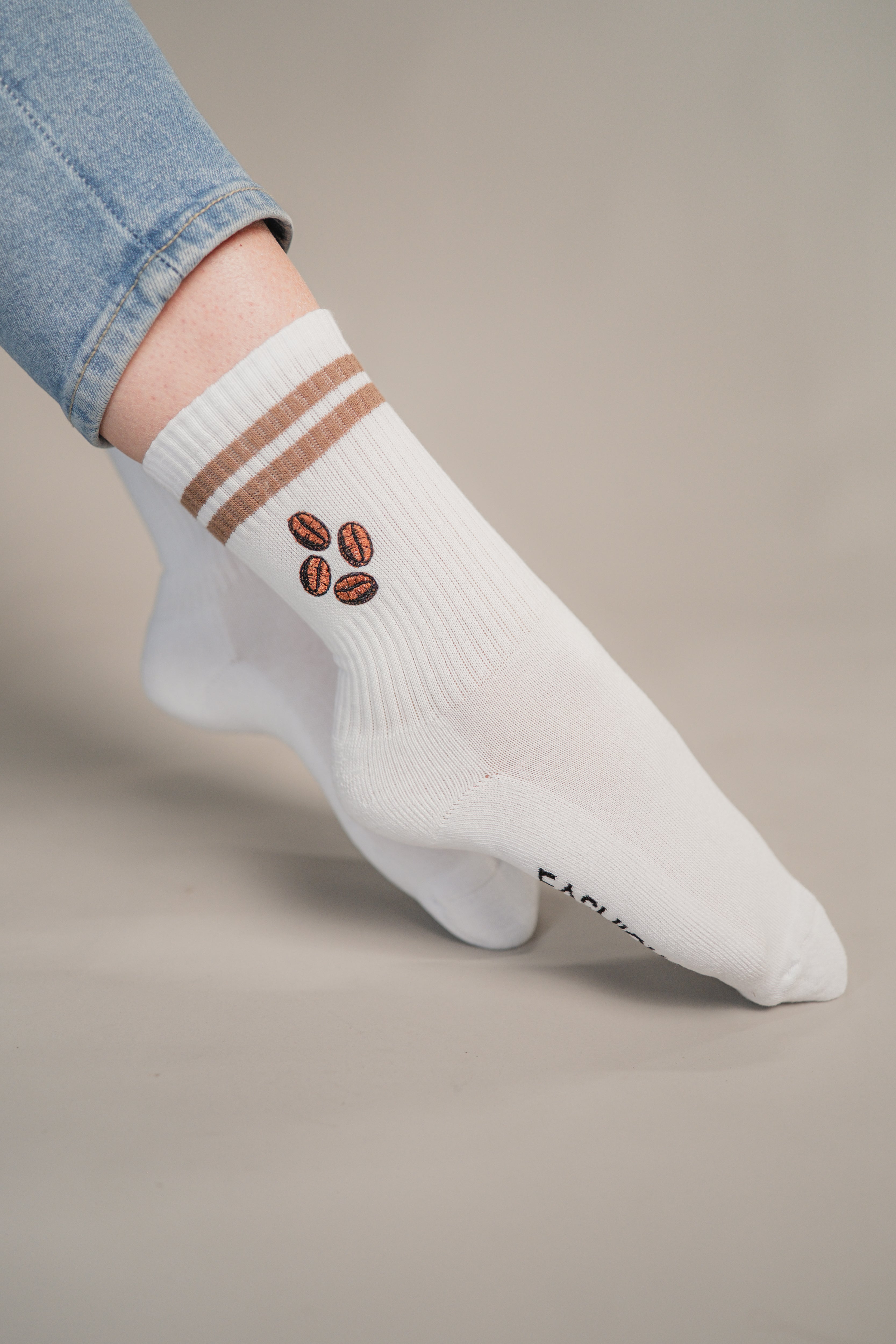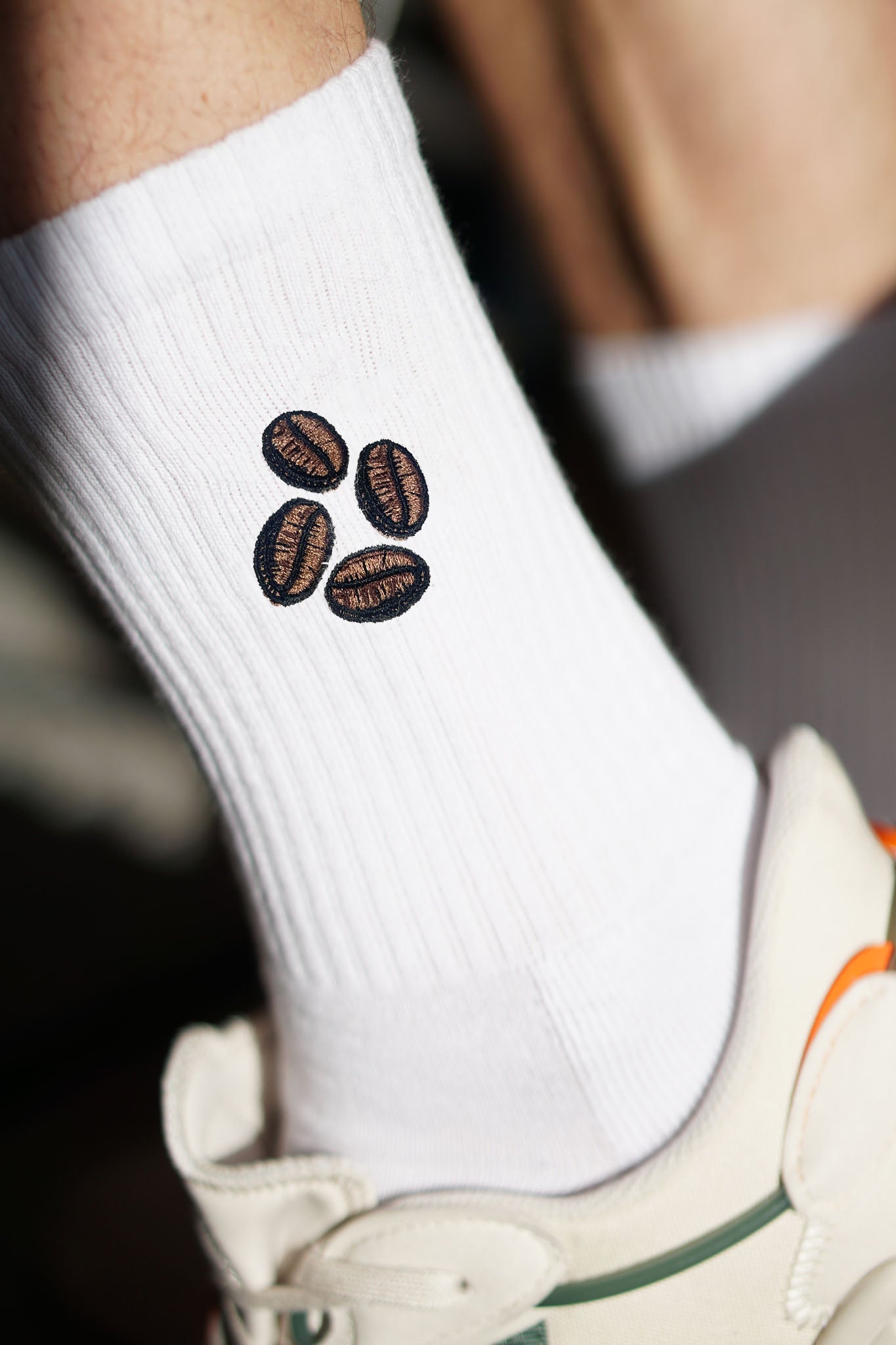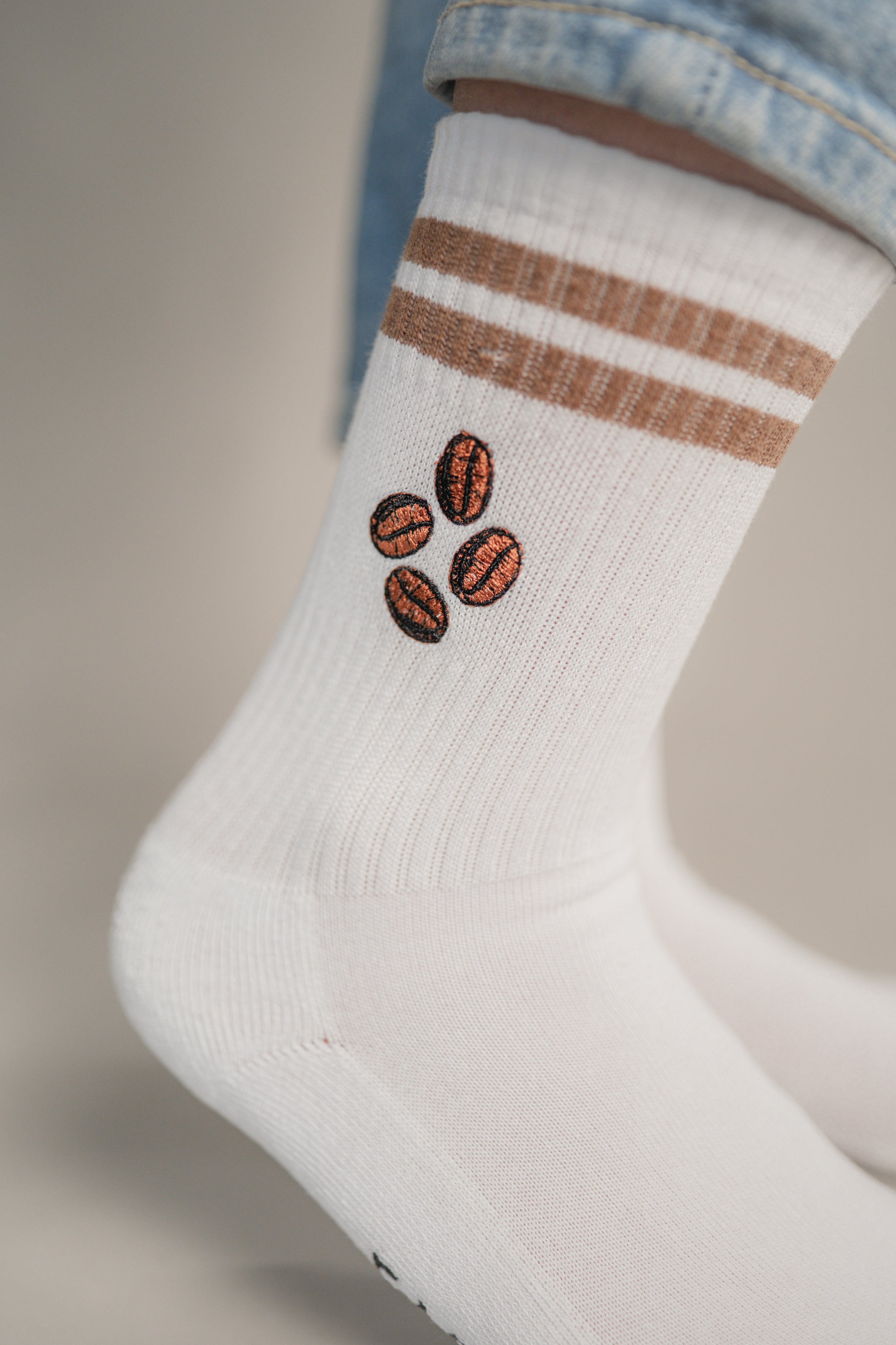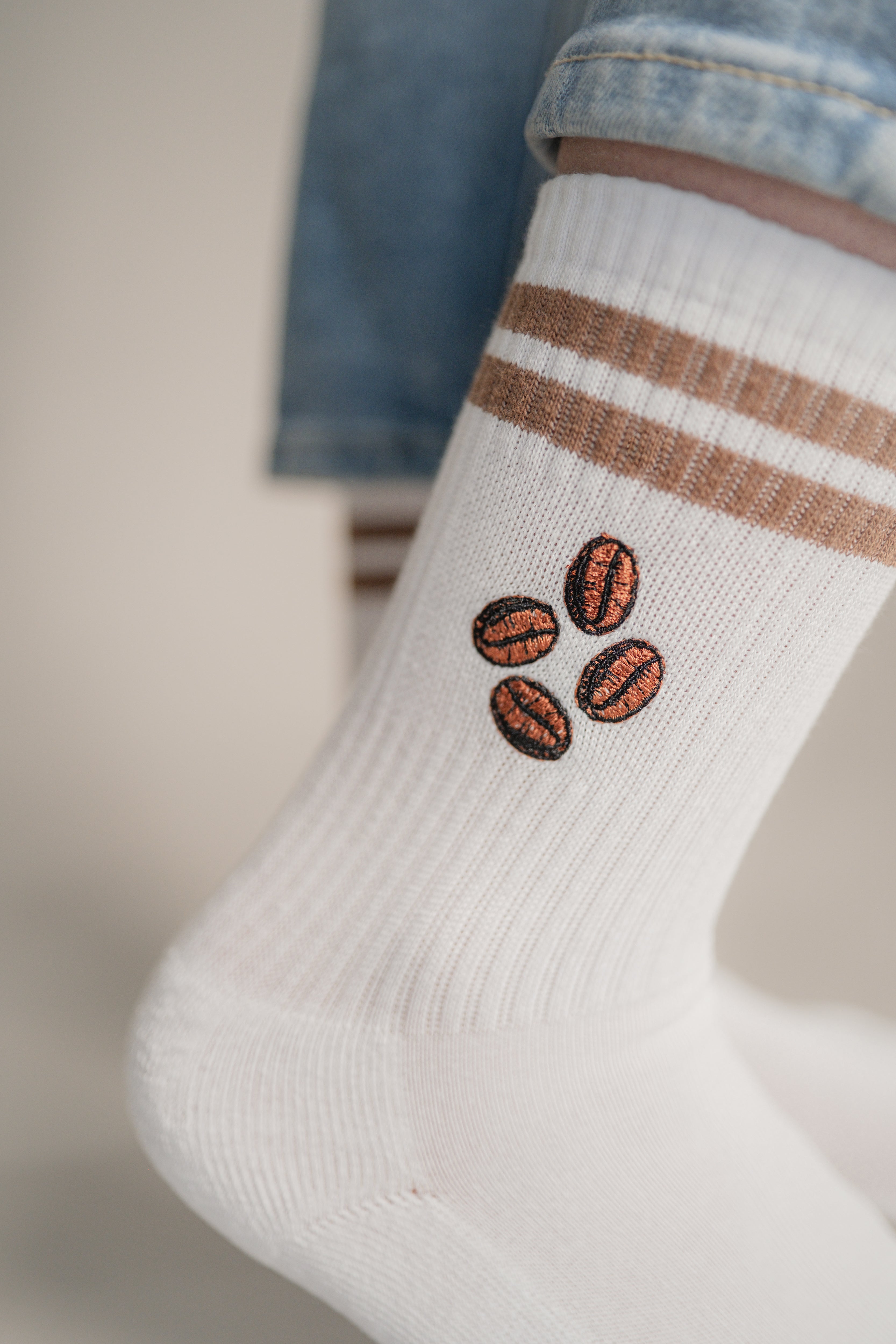 Calzini in cotone organico di altissima qualità con disegno di chicchi di caffè ricamati
