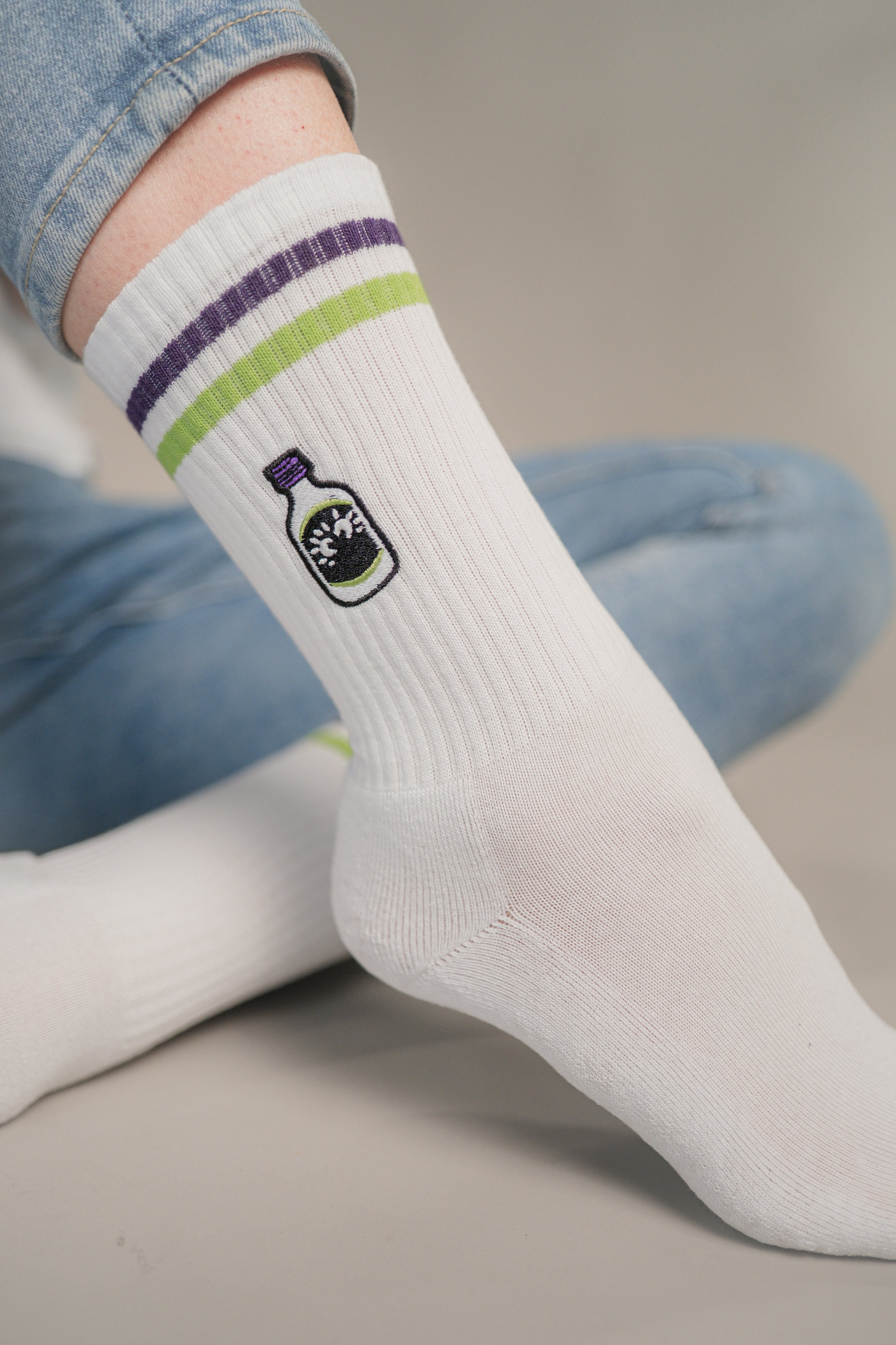 Die Stickerei auf unseren Fashion Drinks Socken bleibt auch nach mehrmaligem Waschen in einwandfreier Form. Wir verwenden präzise Industriemaschinen, die speziell für feine, detaillierte Stickarbeiten entwickelt wurden. So bleibt die Stickerei stabil und die Socken behalten ihre Form. Um die Qualität zu erhalten, empfehlen wir, die Socken bei niedrigen Temperaturen zu waschen und sie auf links zu drehen.