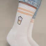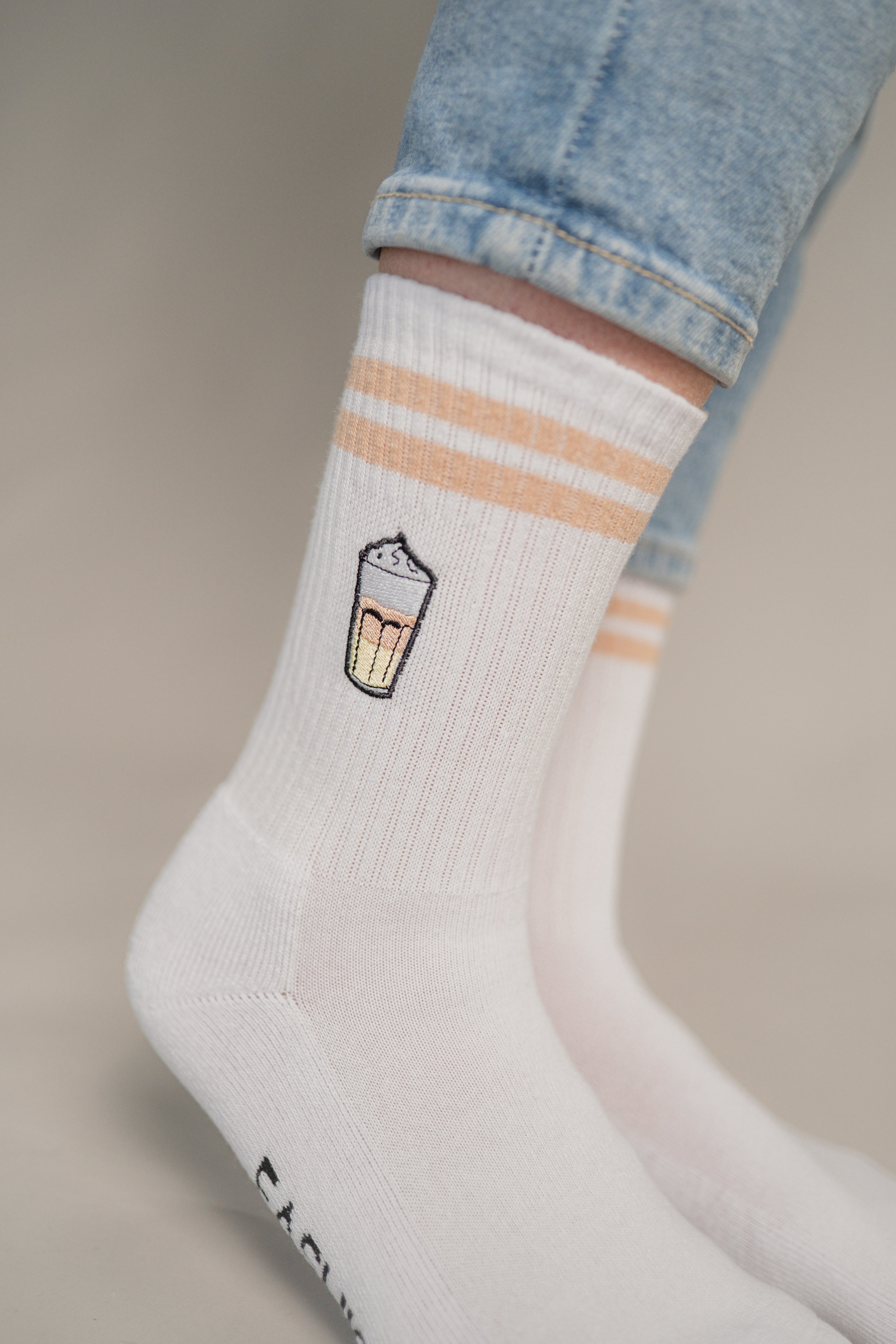 Super hochwertige Bio Baumwoll Crew Socken mit gesticktem Latte Macchiato Design