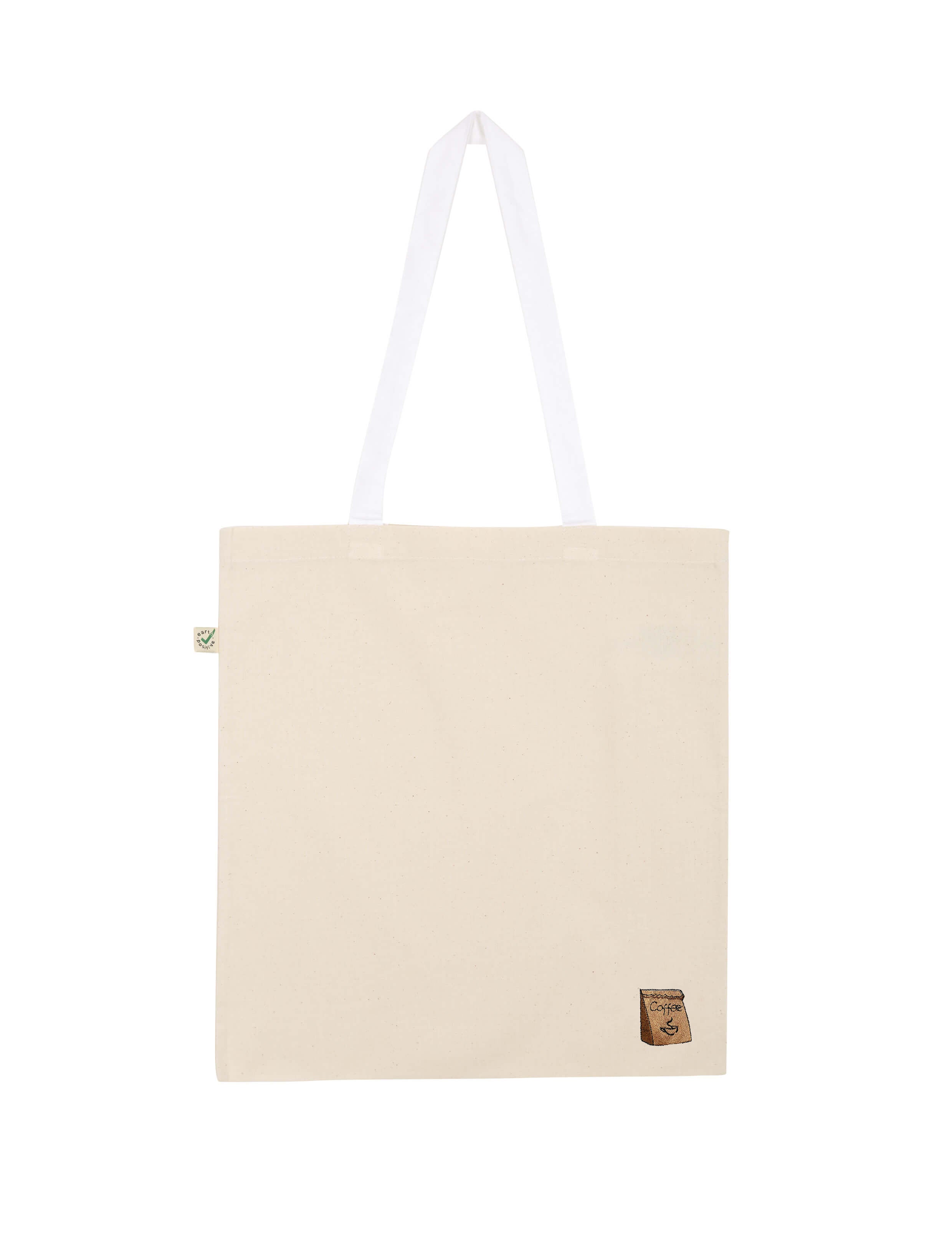 Bestickte, Fair produzierte Bio-Baumwoll-Tragetasche im Coffee Bag Design.