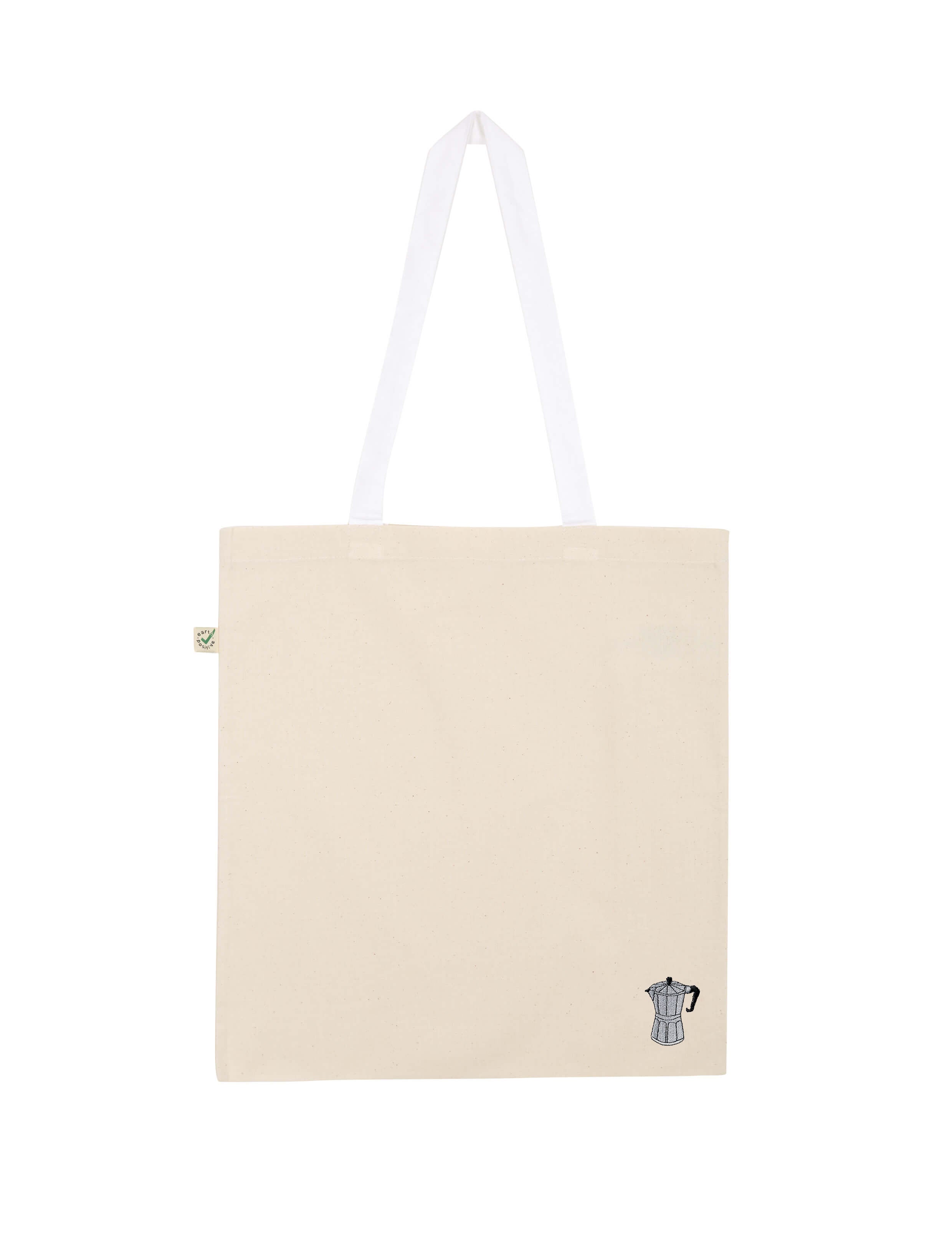 Bestickte, Fair produzierte Bio-Baumwoll-Tragetasche im Espressokocher Design.