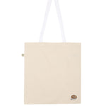 Bestickte, Fair produzierte Bio-Baumwoll-Tragetasche im Flat White Design.