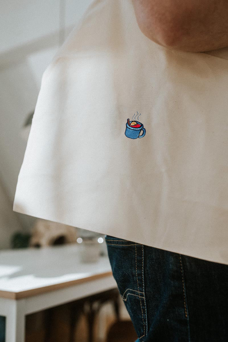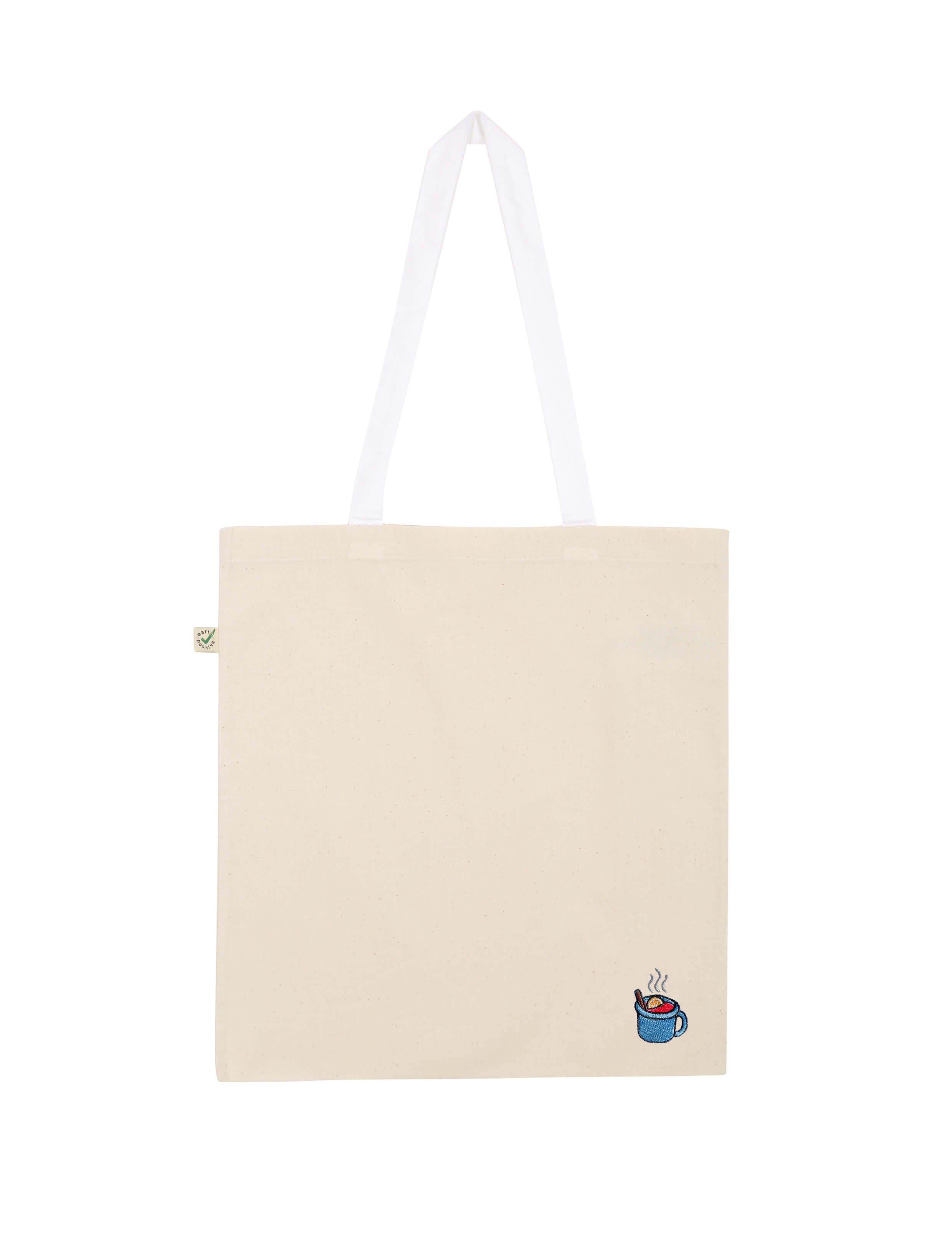 Borsa in cotone biologico ricamata e prodotta in modo equo con disegno di vin brulè.