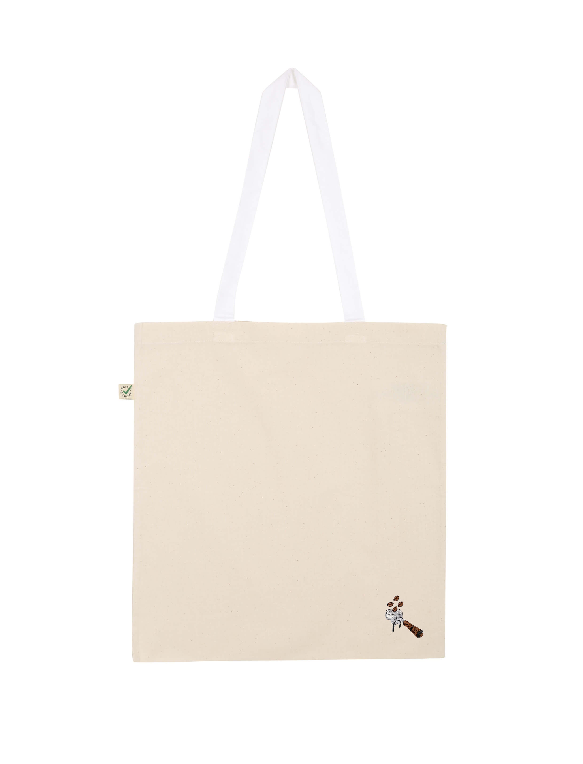Bestickte, Fair produzierte Bio-Baumwoll-Tragetasche im Siebträger Beans Design.
