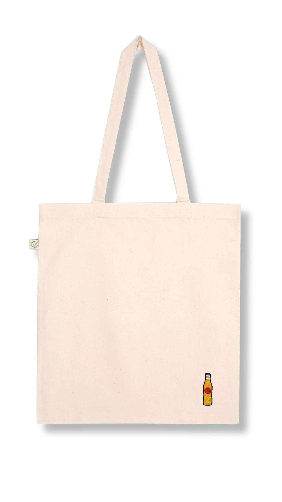 Bestickte, fair produzierte Bio-Baumwoll-Tragetasche im offiziellen Sinalco Design.