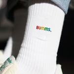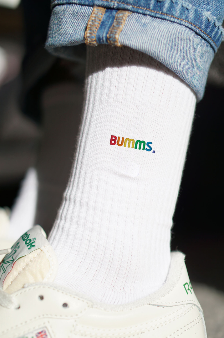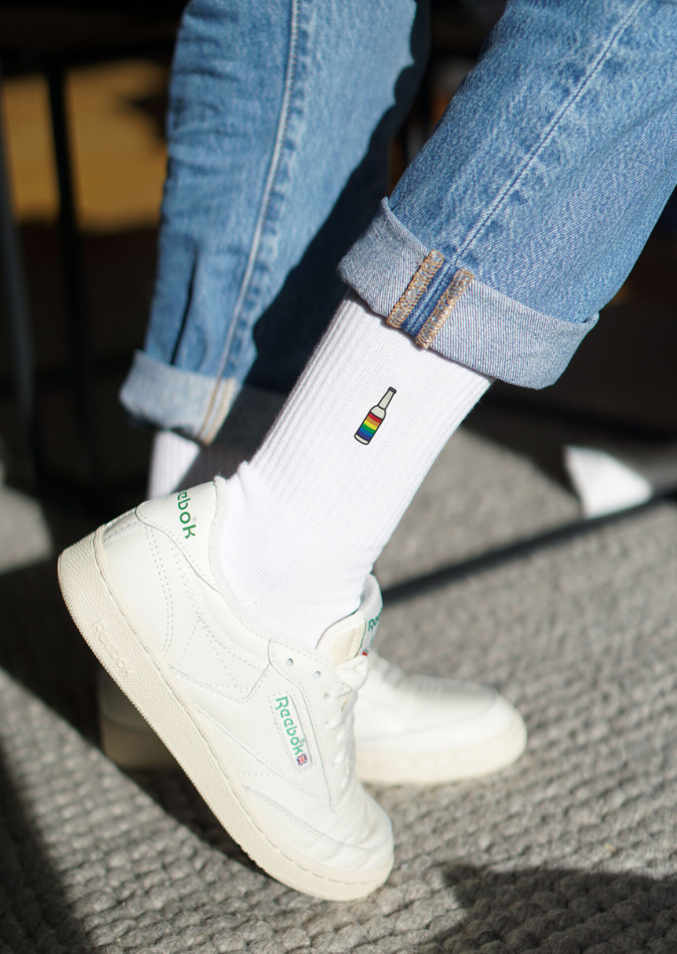• Calzini ricamati all'esterno: "BUMMS." a sinistra, disegno della bottiglia a destra.