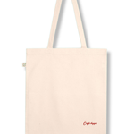 Bestickte, Fair produzierte Bio-Baumwoll-Tragetasche im Caffé doppio Design.