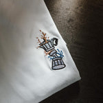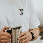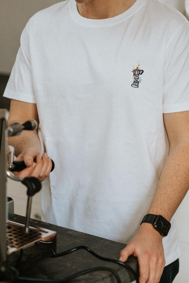 Super hochwertiges Bio Baumwoll Unisex T-Shirt mit schwerem Stoff (190gsm) und gesticktem Espressokocher Boom Design
