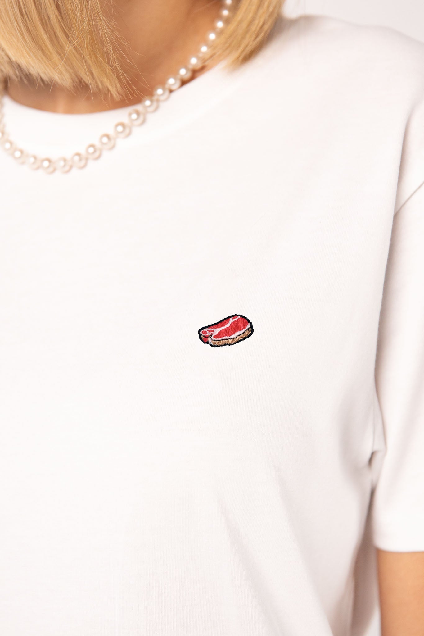 Besticktes Bio Baumwoll Frauen T-Shirt mit extrem angenehmen Stoff (155gsm) und gesticktem Steak Design