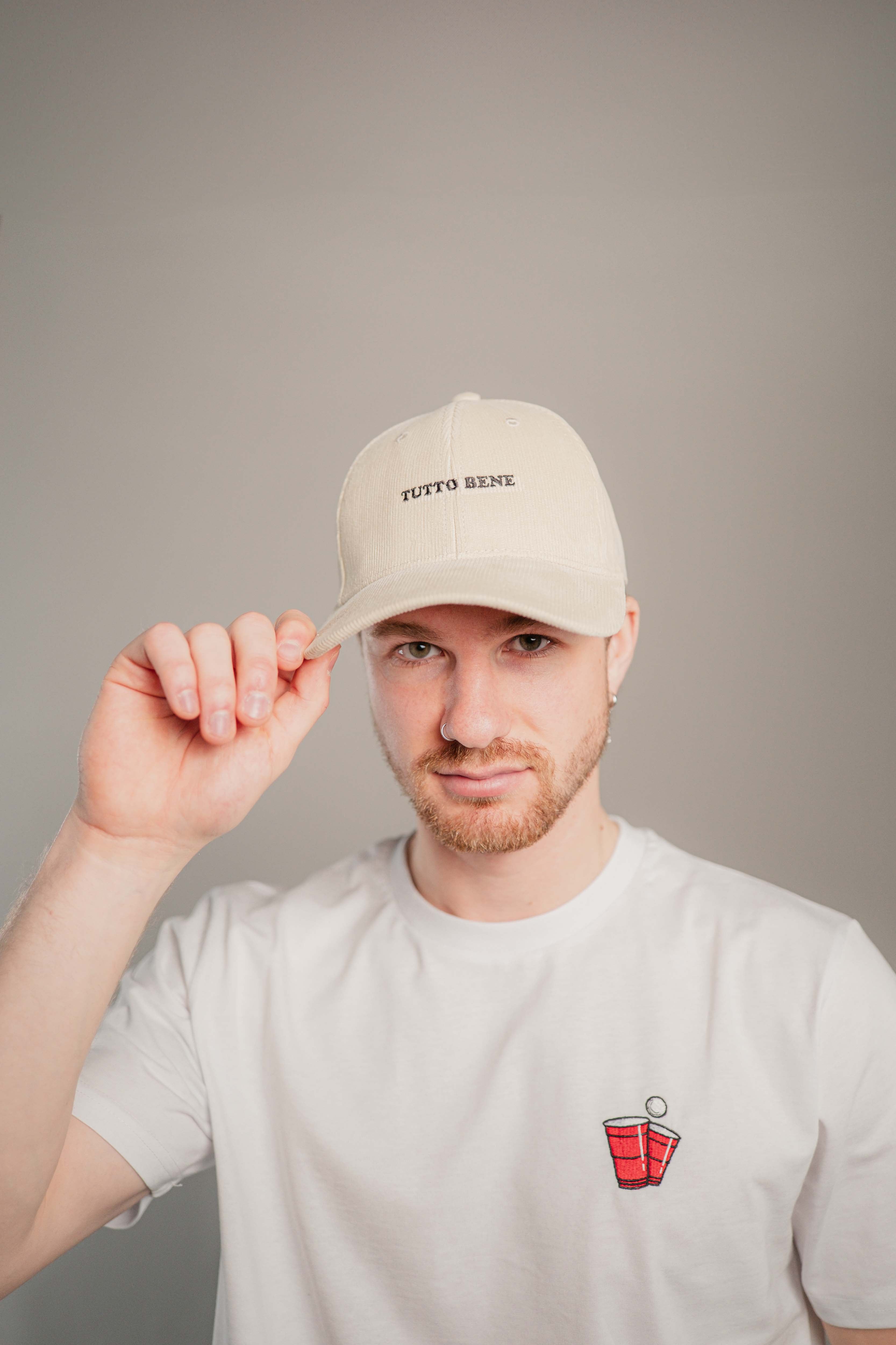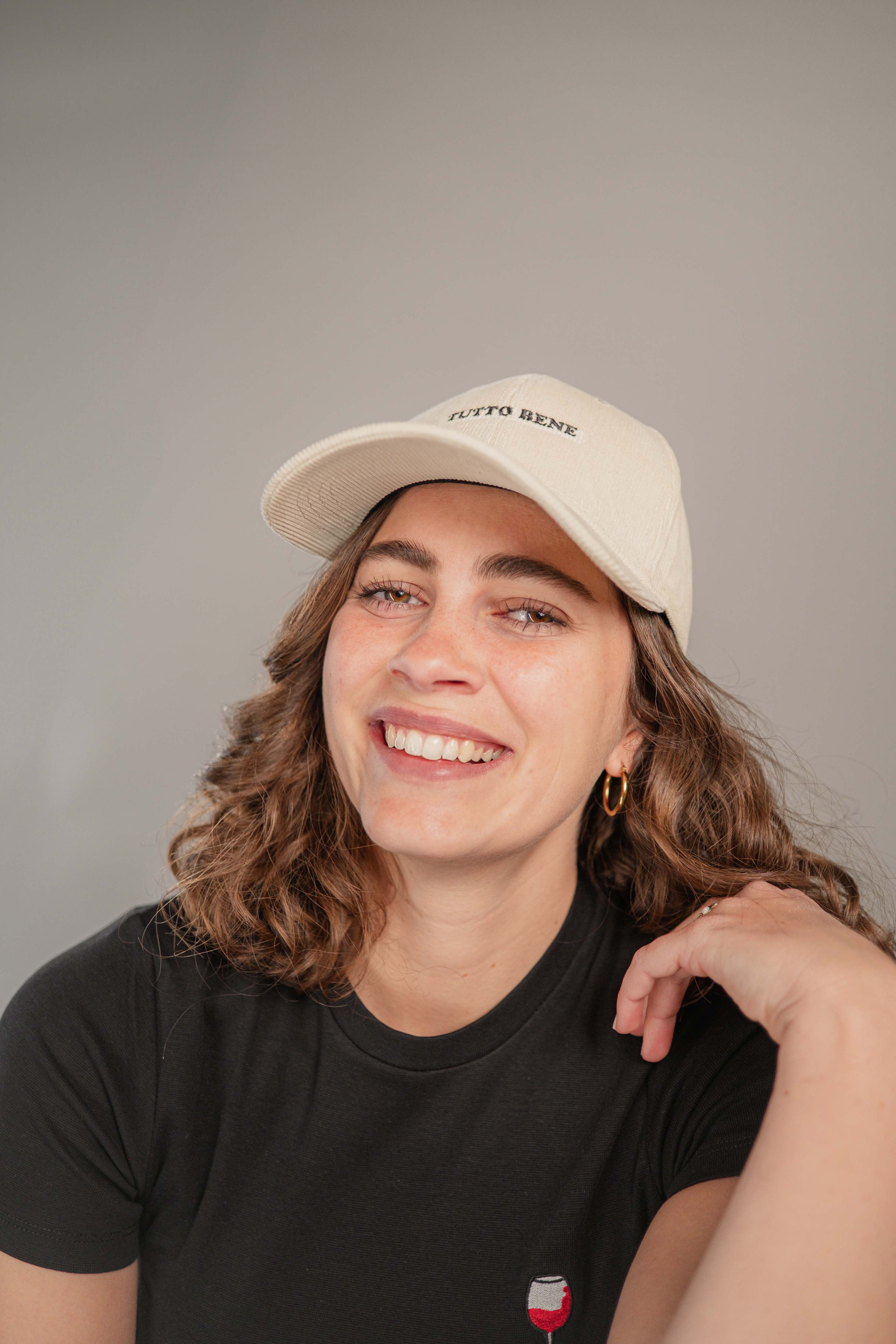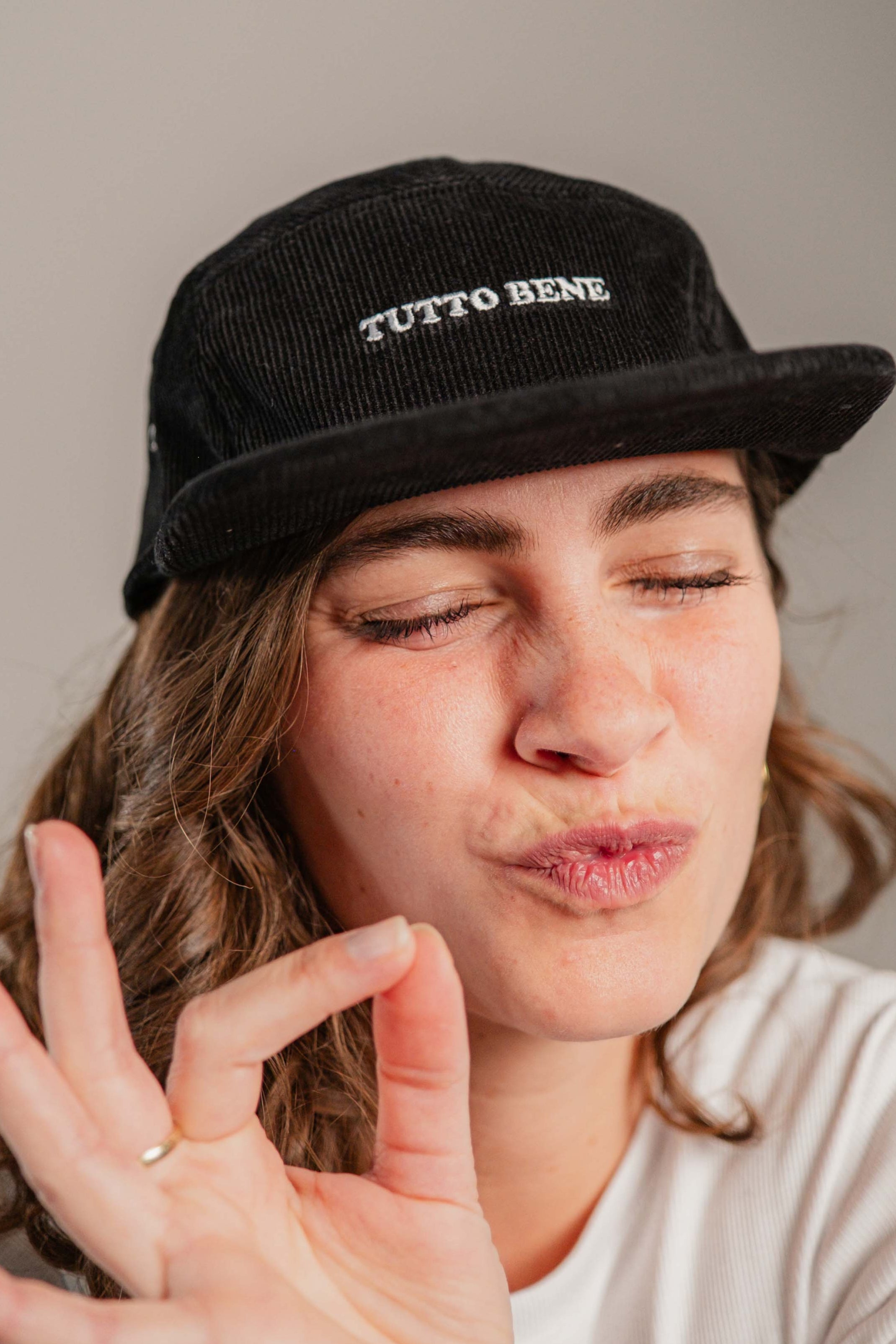 Super hochwertige Cord Cap aus 100% Bio Baumwolle mit gestickten "Tutto Bene" Schriftzug vorne und kleiner gestickter ok Hand seitlich