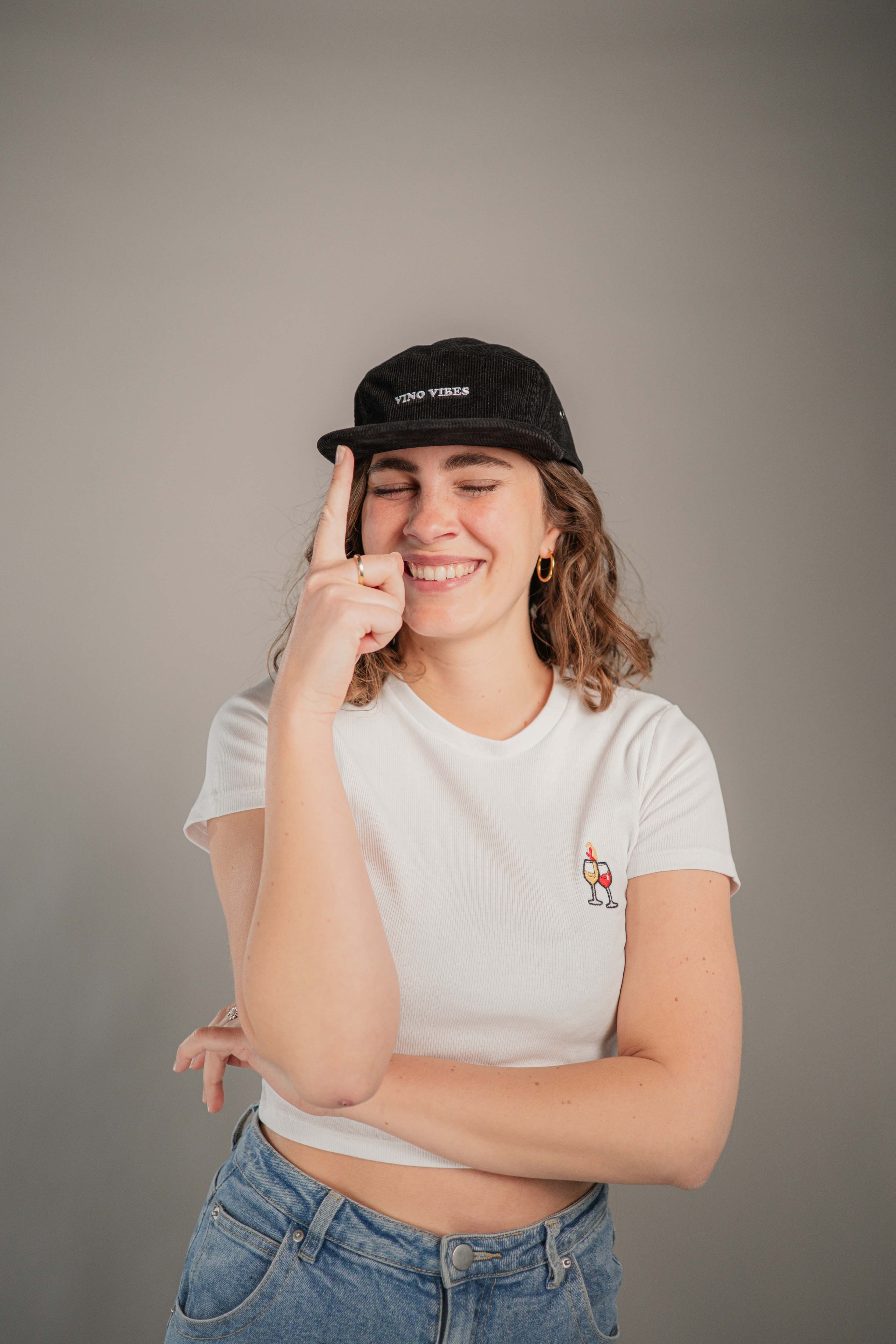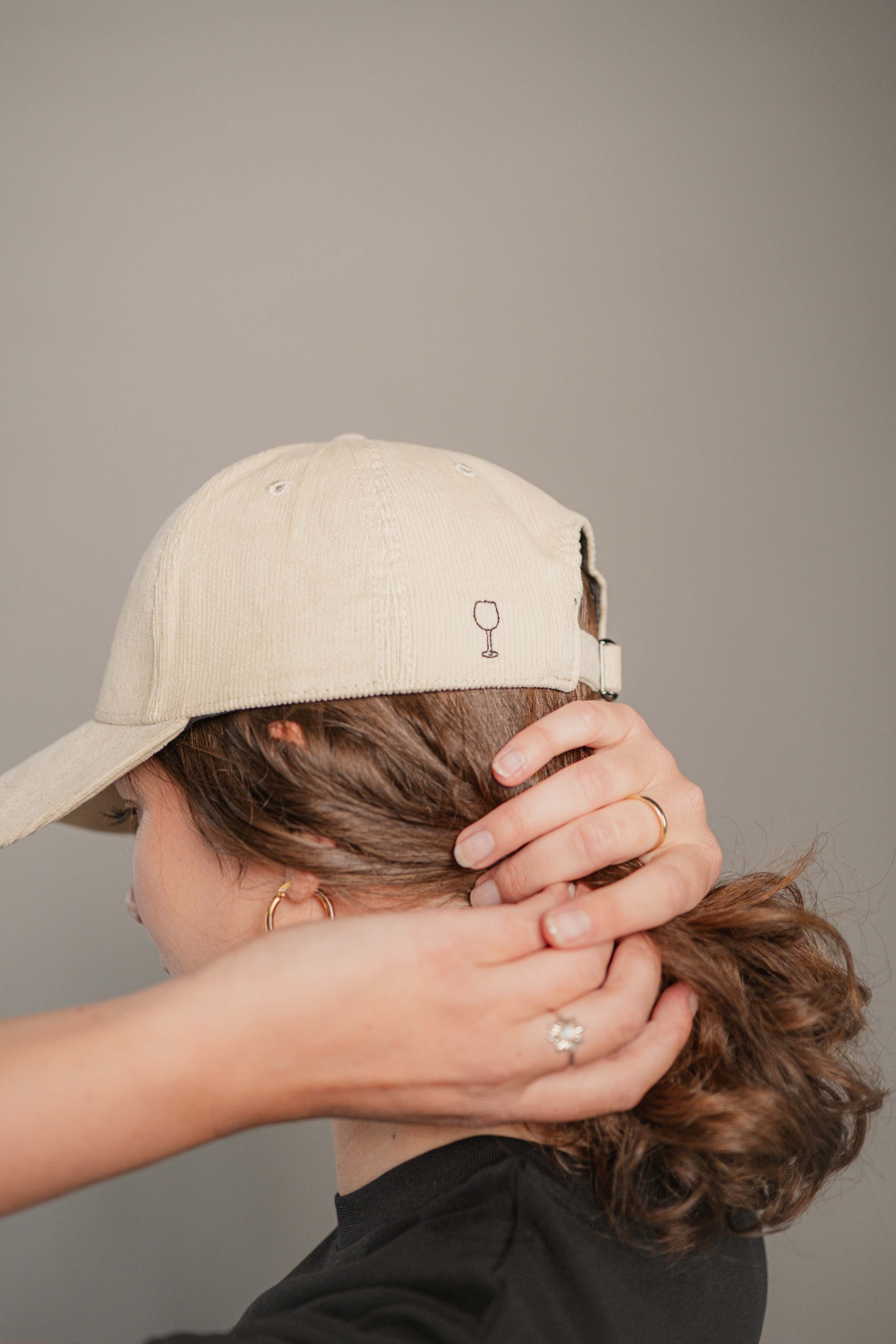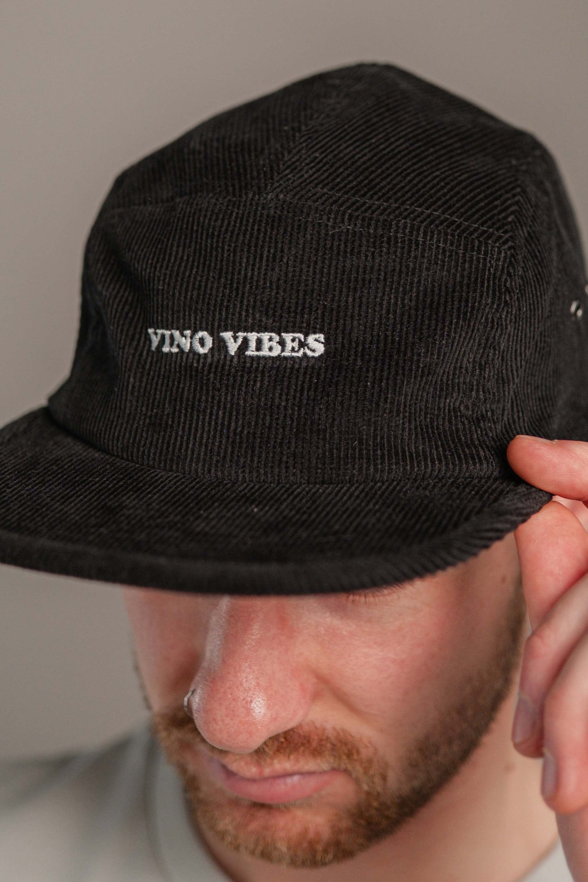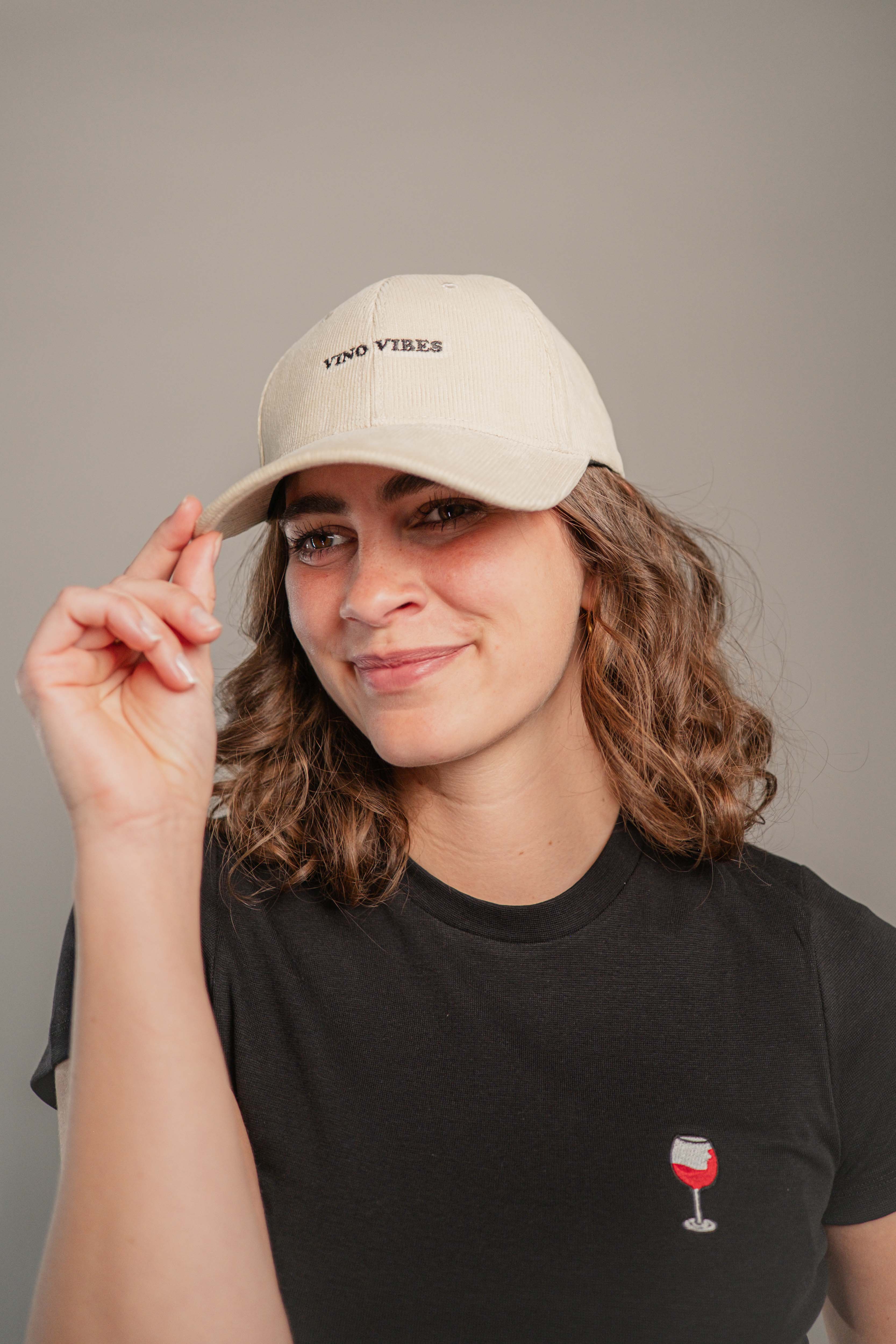 Super hochwertige Cord Cap aus 100% Bio Baumwolle mit gesticktem Vino Vibes Schriftzug vorne und kleinem gesticktem Weinglas seitlich