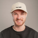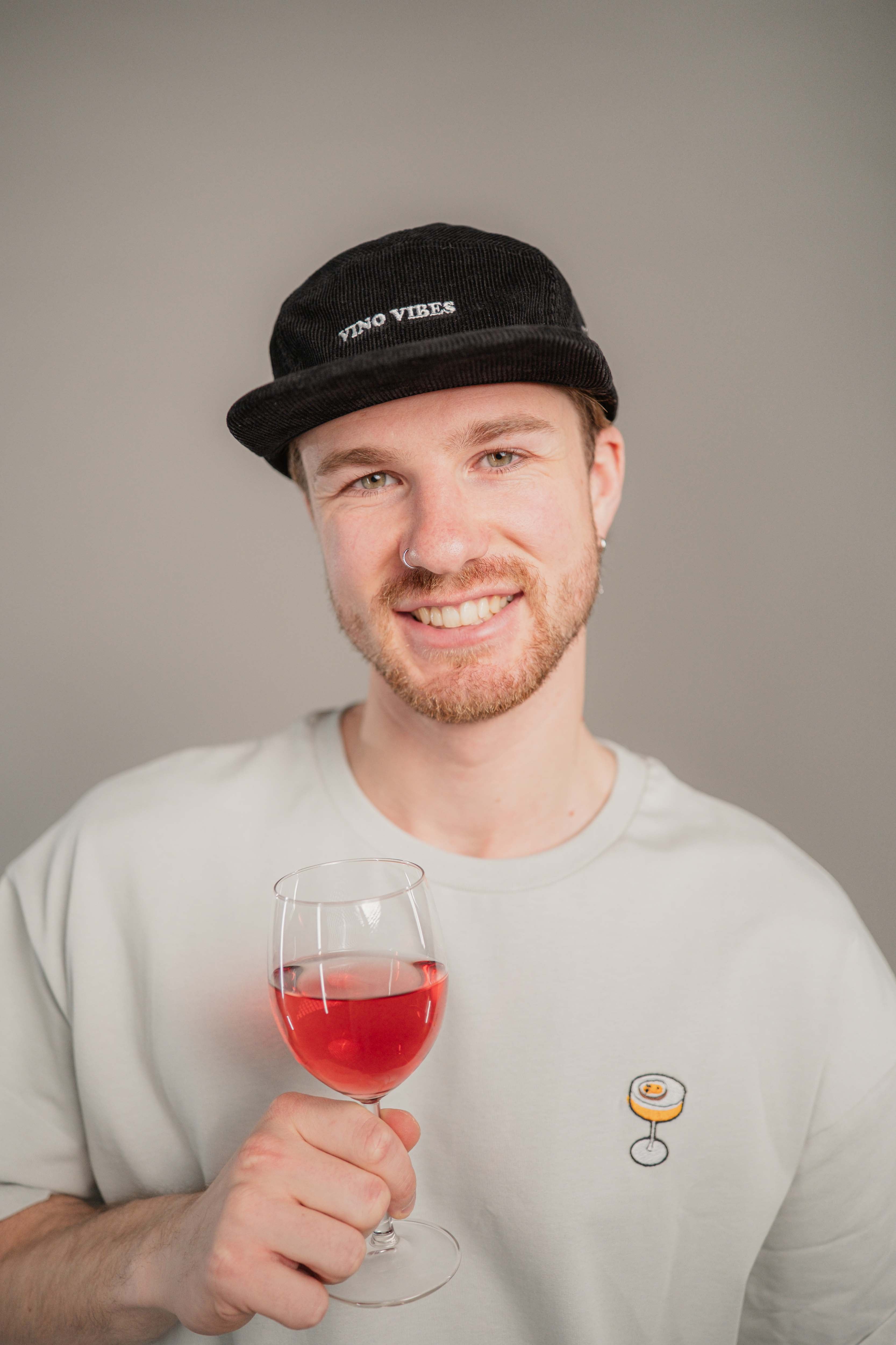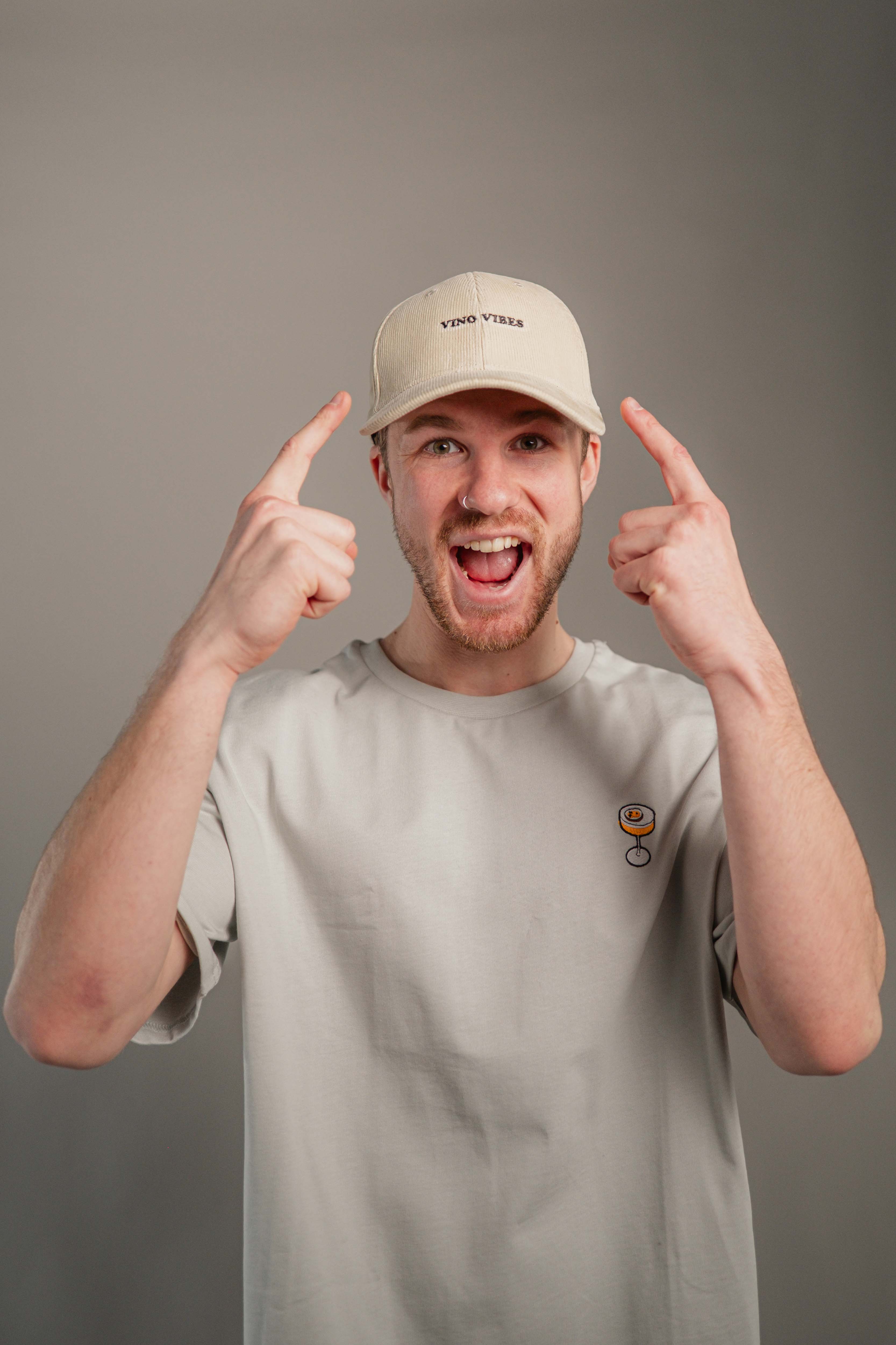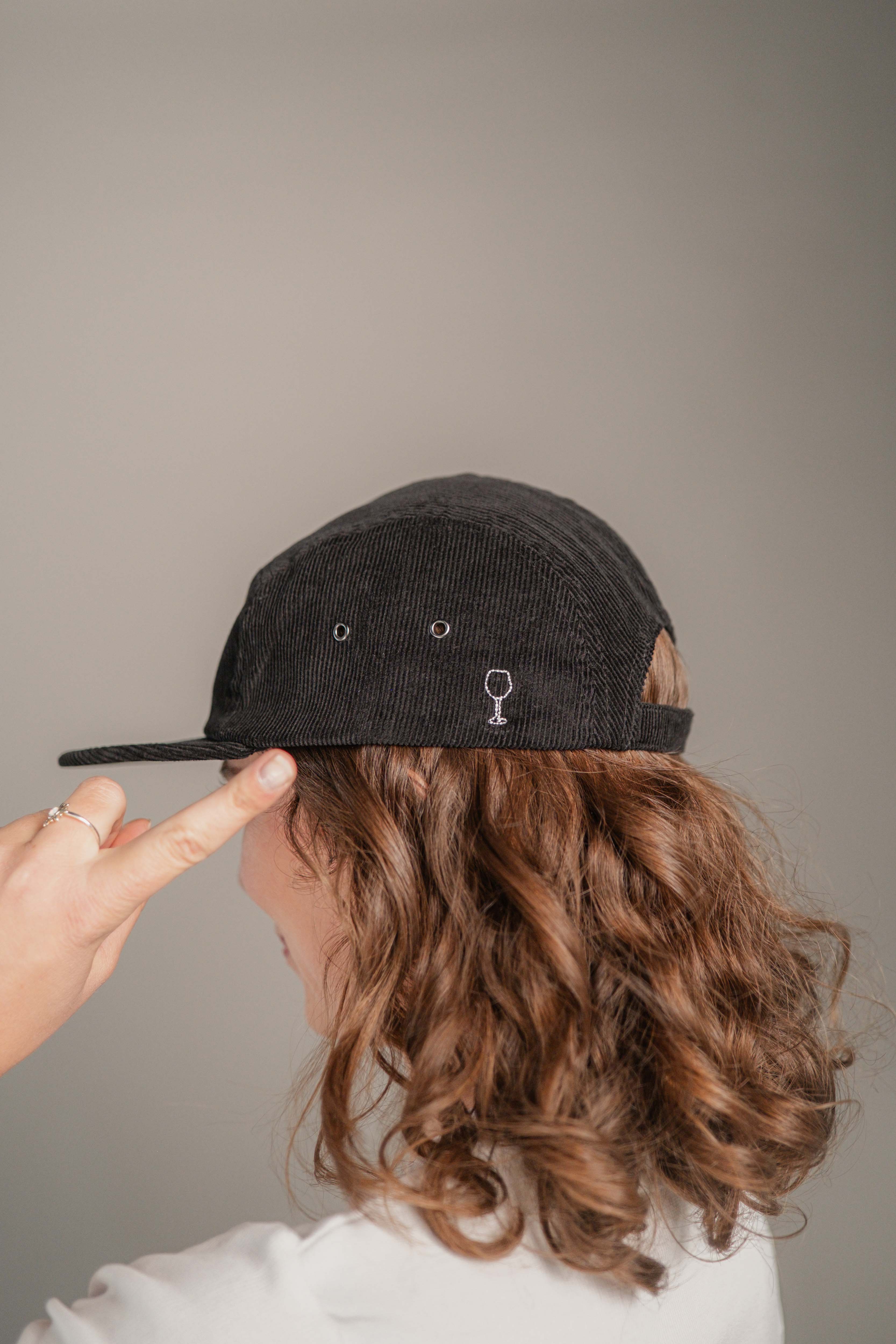 Super hochwertige Cord Cap aus 100% Bio Baumwolle mit gesticktem Vino Vibes Schriftzug vorne und kleinem gesticktem Weinglas seitlich