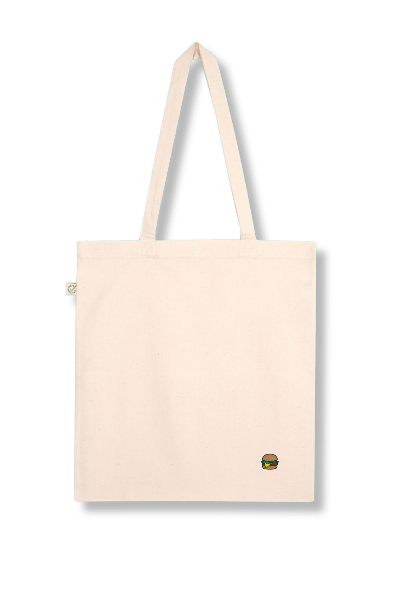 Bestickte, fair produzierte Bio-Baumwoll-Tragetasche im Burger Design.