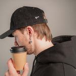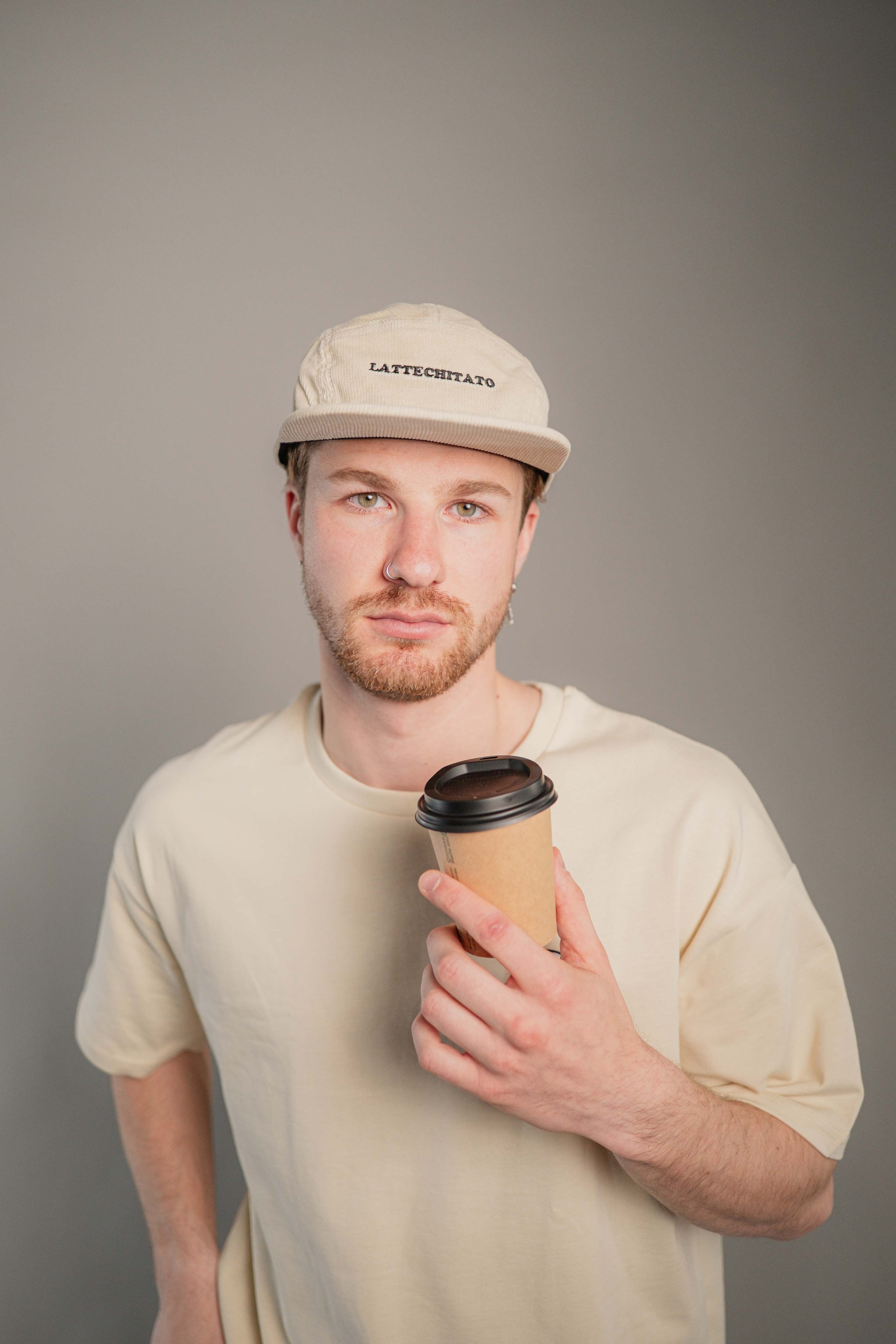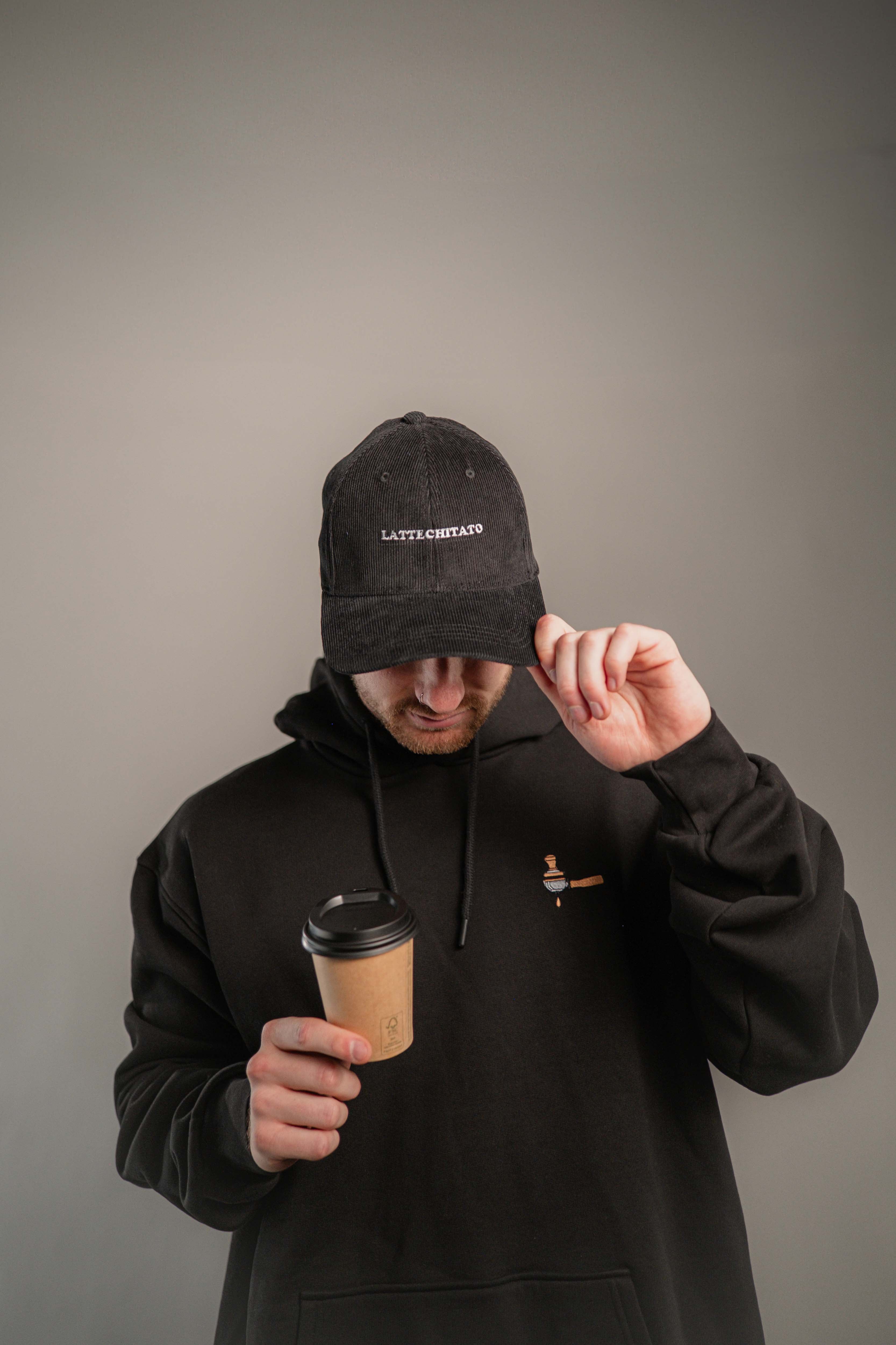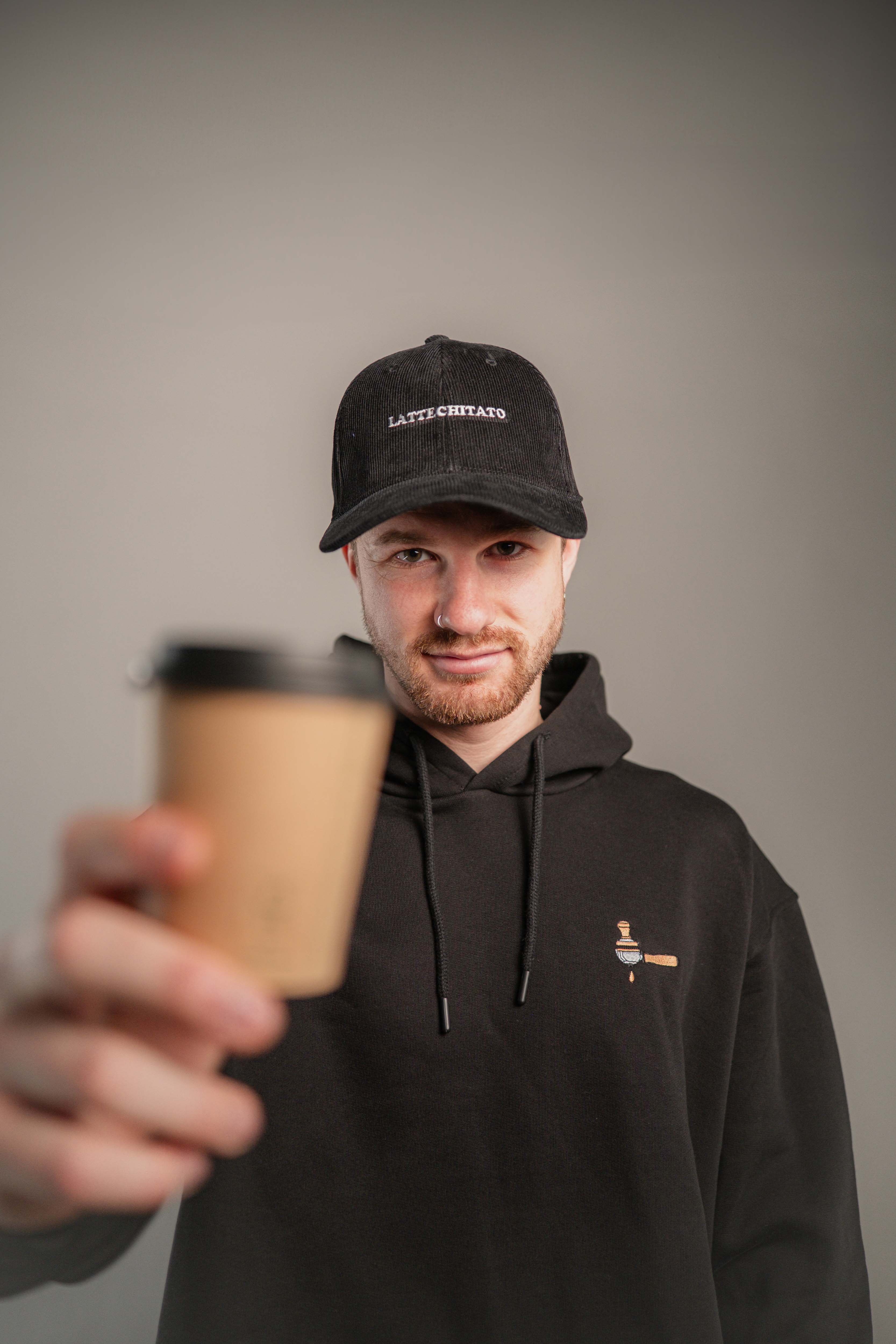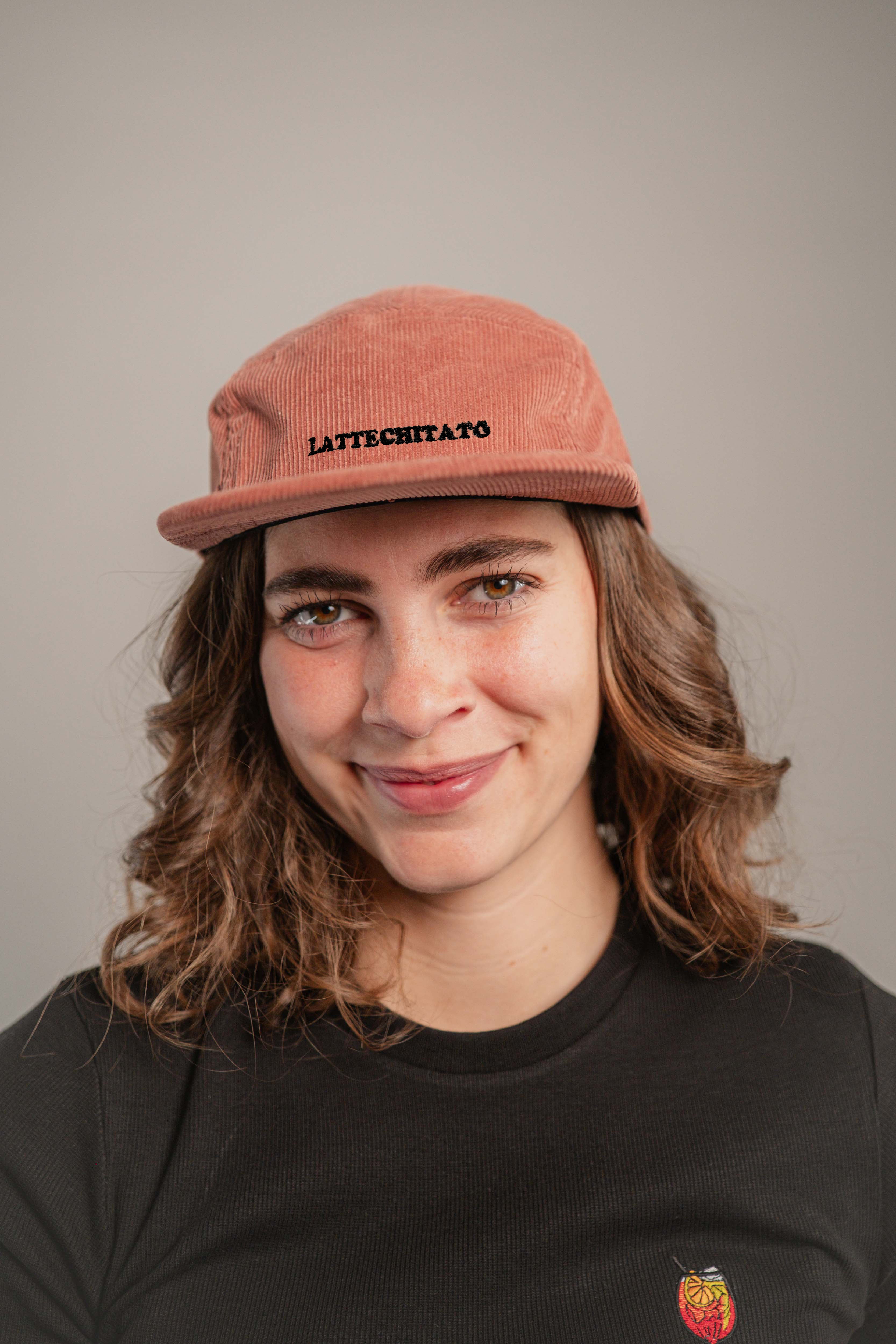 Super hochwertige Cord Cap aus 100% Bio Baumwolle mit gestickten "Lattechitato" Schriftzug vorne und kleinen gestickten  Siebträger seitlich